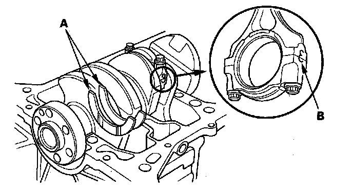 9. Seating the rod journals into connecting rod No. 1 and connecting rod No.4. Line up the mark (B) on the connecting rod and cap, then install the caps and bolts finger-tight.