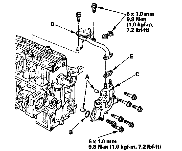 23. Install the dowel pins (A) and new O-ring (B) on the oil pump (C), then align the inner rotor with crankshaft, and install the oil pump.