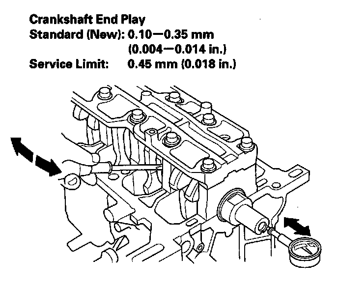 4. Push the crankshaft firmly away from the dial indicator, and zero the dial against the end of the crankshaft. Then pull the crankshaft firmly back toward the indicator; the dial reading should not exceed the service limit.