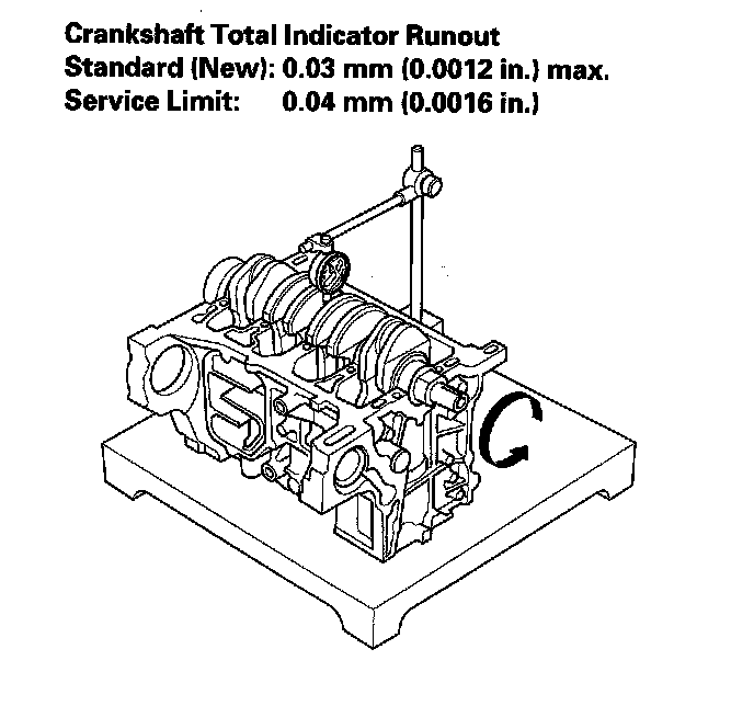 5. Measure runout on all main journals to make sure the crank is not bent. Rotate the crankshaft two complete revolutions. The difference between measurements on each journal must not be more than the service limit.