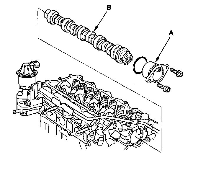 6. Remove the camshaft thrust cover (A), then pull out the camshaft (B).