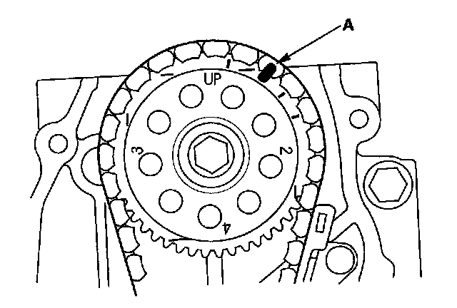 2. Make a reference mark (A) across the camshaft sprocket and cam chain.