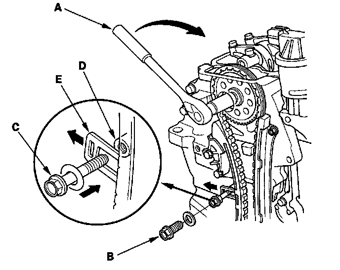 6. Remove the maintenance bolt (B), and turn the camshaft clockwise to compress the cam chain tensioner, then install the 6 x 1.0 mm bolt (C) in the bolt hole (D) on the engine block through the maintenance hole and cam chain tensioner (E).