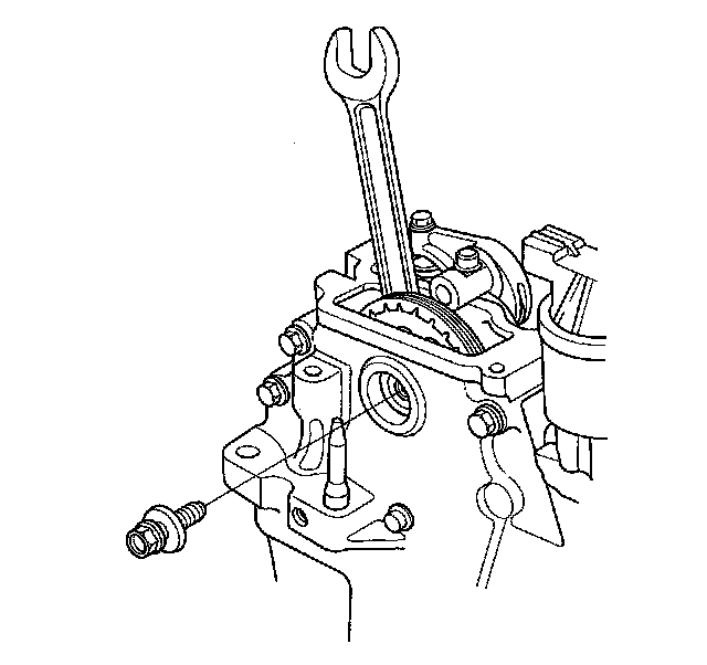 7. Hold the camshaft with a 27 mm open-end wrench, then remove the camshaft sprocket.