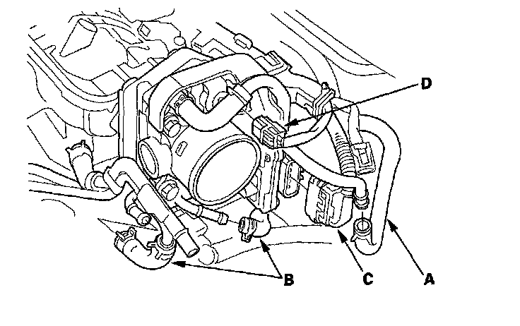 39. Install the purge hose (A), water bypass hoses (B), throttle body connector (C) and evaporative emission (EVAP) canister purge valve connector (D).