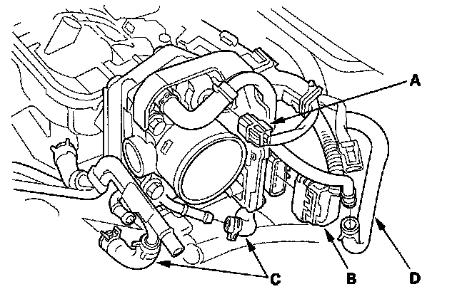4. Disconnect the evaporative emission (EVAP) canister purge valve connector (A), throttle body connector (B), water bypass hoses (C) and purge hose (D).