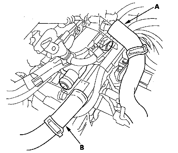 5. Disconnect the upper radiator hose (A) and the lower radiator hose (B).