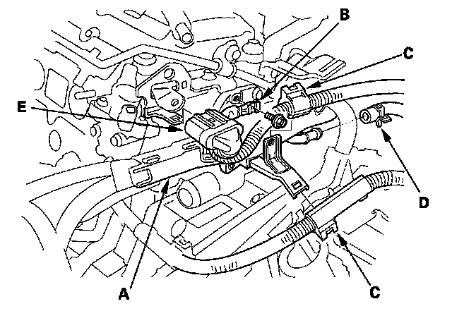 12. Remove the harness holder (A), ground cable (B), harness clamps (C), water bypass hose (D) and engine junction connector clamp (E).