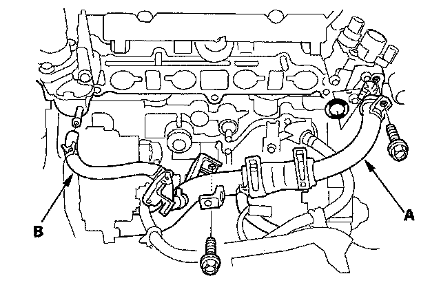 13. Disconnect the connecting pipe (A) and water bypass hose (B).