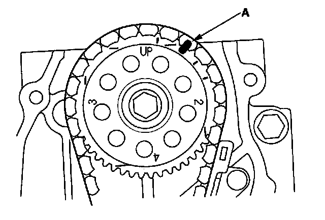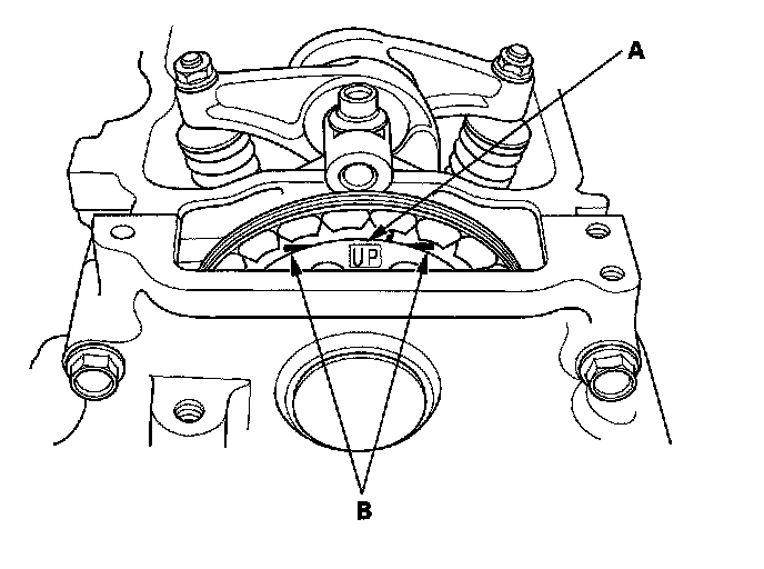 17. Set the No. 1 piston at top dead center (TDC). The "UP" mark (A) on the camshaft sprocket should be at the top, and the TDC grooves (B) on the camshaft sprocket should line up with the top edge of the head.