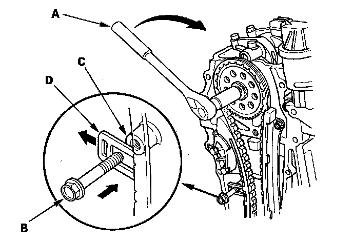 29. Turn the camshaft clockwise to compress the cam chain tensioner, then install the 6 x 1.0 mm bolt (B) in the bolt hole (C) on the engine block through the cam chain tensioner (D).