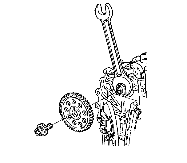 30. Hold the camshaft with a 27 mm open-end wrench, then remove the camshaft sprocket.