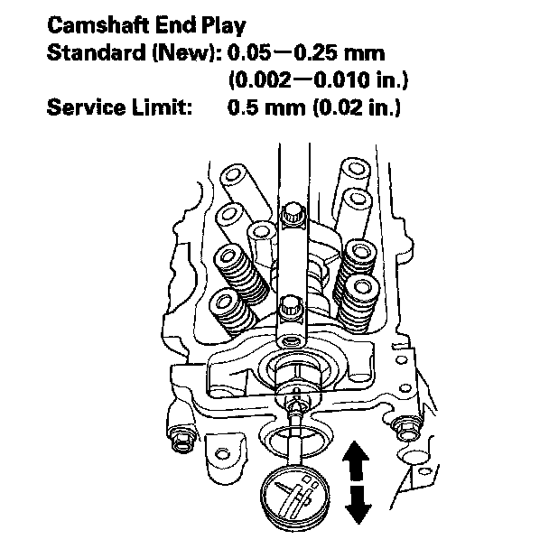 5. Zero the dial indicator against the end of the camshaft. Push the camshaft back and forth and read the end play. If the end play is beyond the service limit, replace the thrust cover and recheck. If it is still beyond the service limit replace the camshaft.