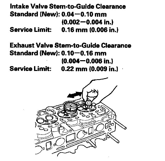 3. Subtract the O.D. of the valve stem, measured with a micrometer, from the I.D. of the valve guide, measured with an inside micrometer or ball gauge. Take the measurements in three places along the valve stem and three places inside the valve guide. The difference between the largest guide measurement and the smallest stem measurement should not exceed the service limit.