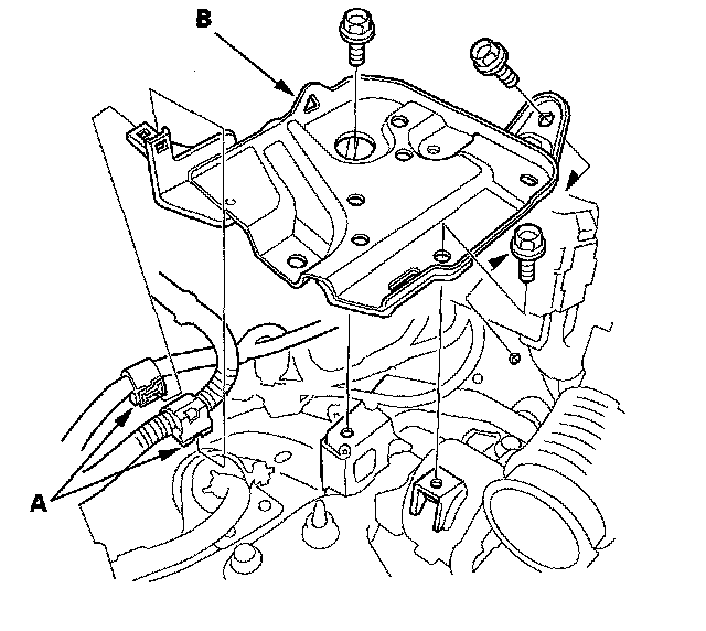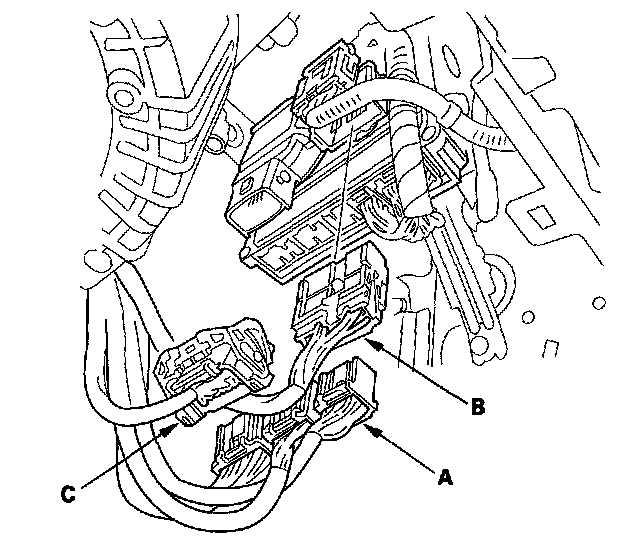 8. Remove the passenger's dashboard undercover, then disconnect the engine control module (ECM)/powertrain control module (PCM) connectors (A), dashboard wire harness connector (B), and throttle actuator control module connector (C).