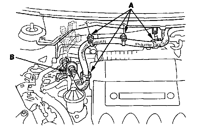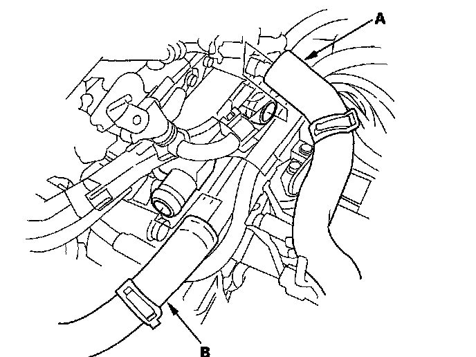 40. Disconnect the upper radiator hose (A) and the lower radiator hose (B).
