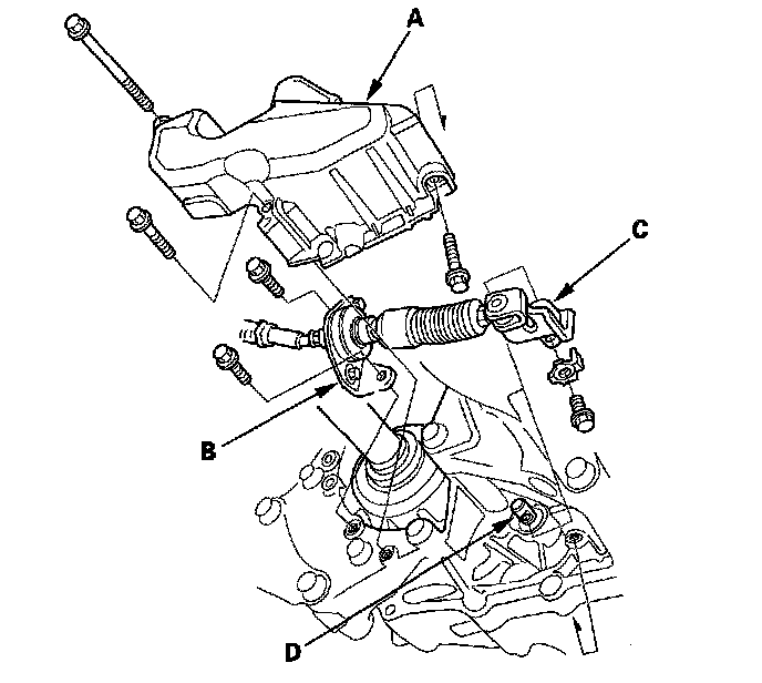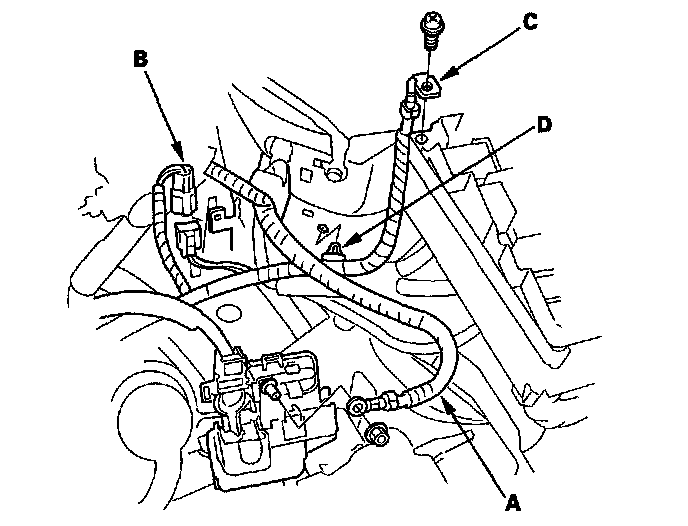 18. M/T model: Remove the breather tube (A) from the clamp (B), clutch slave cylinder (C) and clutch line bracket mounting bolt (D). Do not operate the clutch pedal once the slave cylinder has been removed.