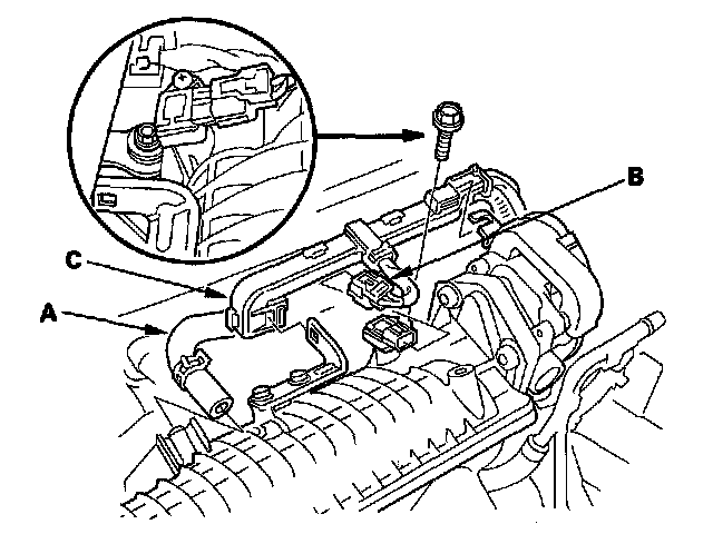 14. Disconnect the brake booster vacuum hose (A) and manifold absolute pressure (MAP) sensor connector (B), then remove the harness holder (C).