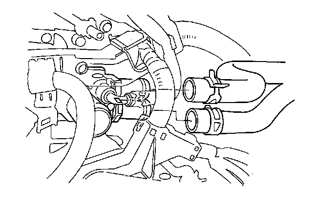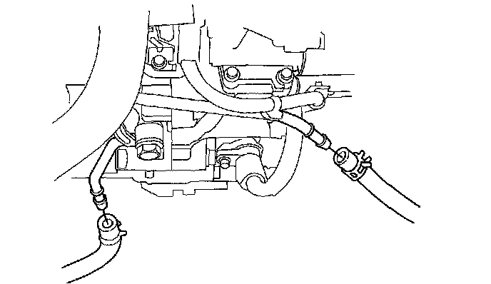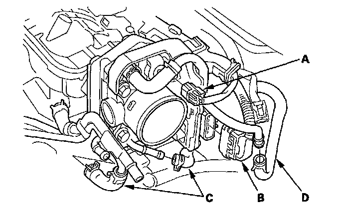 15. Disconnect the evaporative emission (EVAP) canister purge valve connector (A), throttle body connector (B), water bypass hoses (C) and purge hose (D).