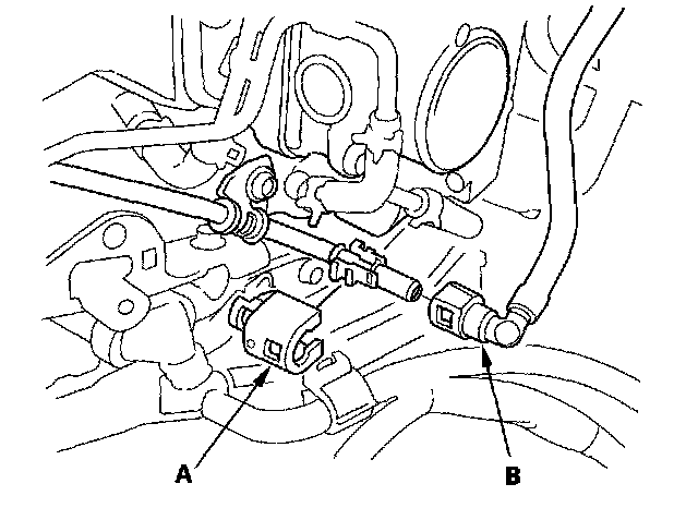 16. Remove the quick-connect fitting cover (A), then disconnect the fuel feed hose (B).