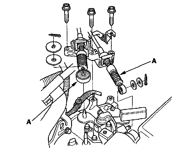 17. M/T model: Remove the shift cables (A). Take care not to bend the cables when removing them. Always replace any kinked cable with a new one.