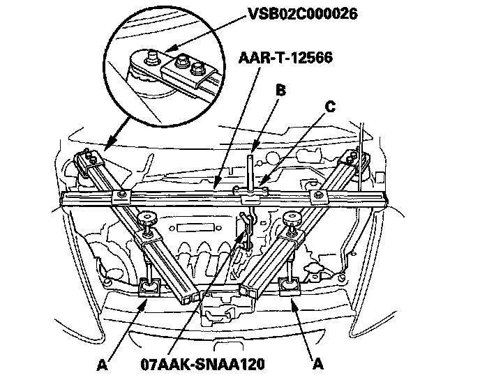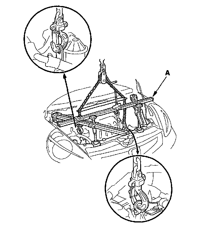 44. Install the front leg assemblies (A), hook (B), and wing nut (C) onto the engine support hanger. Carefully position the engine support hanger on the vehicle, and attach the hook to the slotted hole in the universal eyelet. Tighten the wing nut by hand to lift and support the engine/transmission.