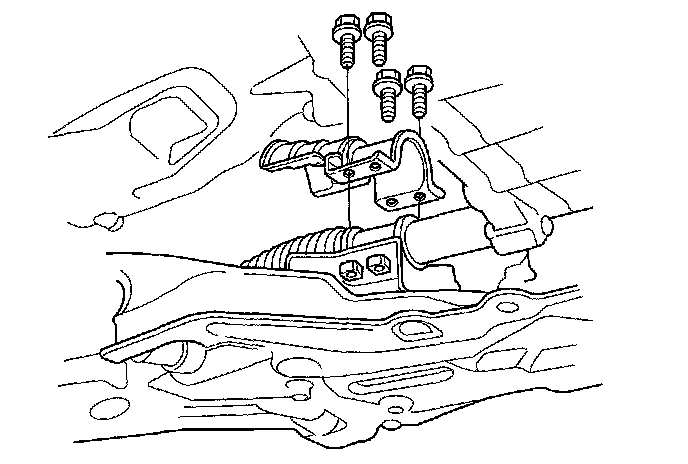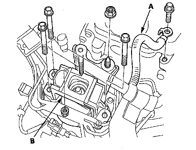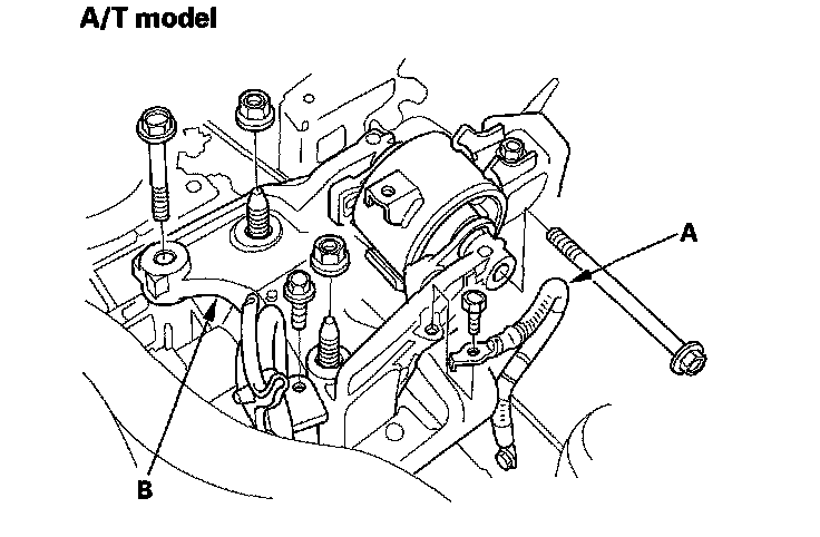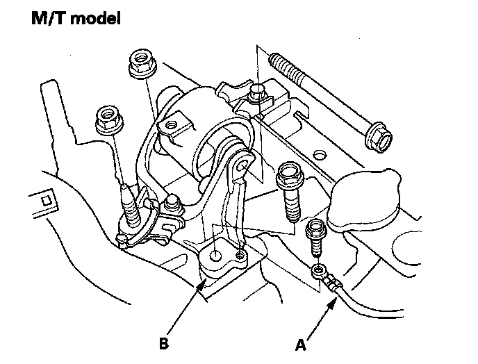 58. Remove the ground cable (A), then remove the transmission mount bracket (B).
