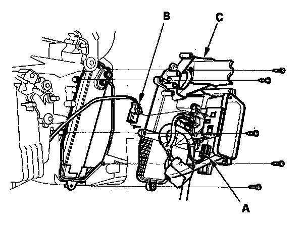 5. Disconnect the connector (A) from the evaporator temperature sensor, then remove the connector clip (B). Remove the self-tapping screws and the duct (C).