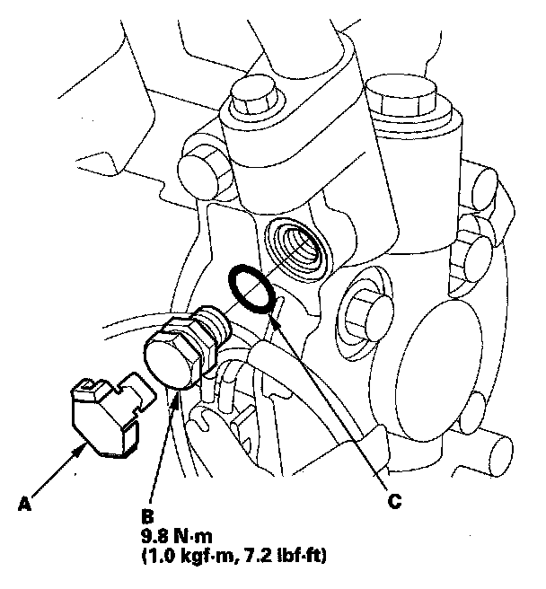2. Remove the relief valve cover (A), the relief valve (B), and the O-ring (C). Plug the opening to keep foreign matter from entering the system and the A/C compressor oil from running out.