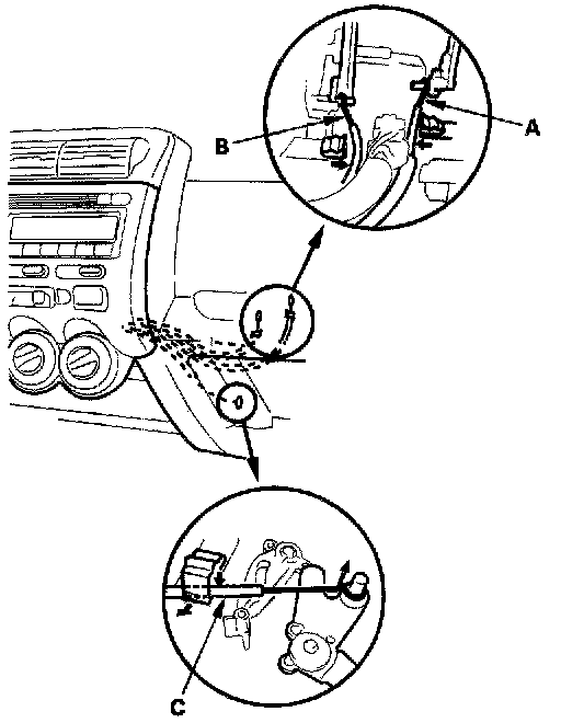 4. Inside the glove box opening, disconnect the recirculation control cable (A) and the mode control cable (B), and from under the dashboard, disconnect the air mix control cable (C). Take care not to bend any cables.