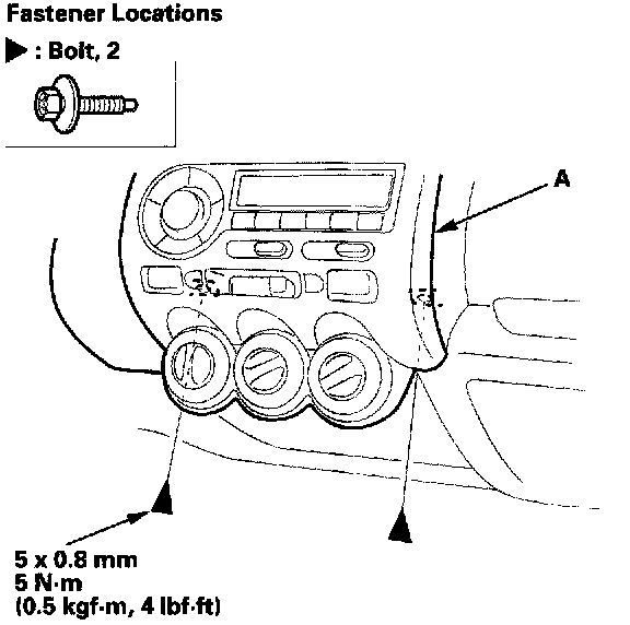 5. From the glove box and driver's dashboard lower cover openings, loosen the bolts securing the center panel (A).