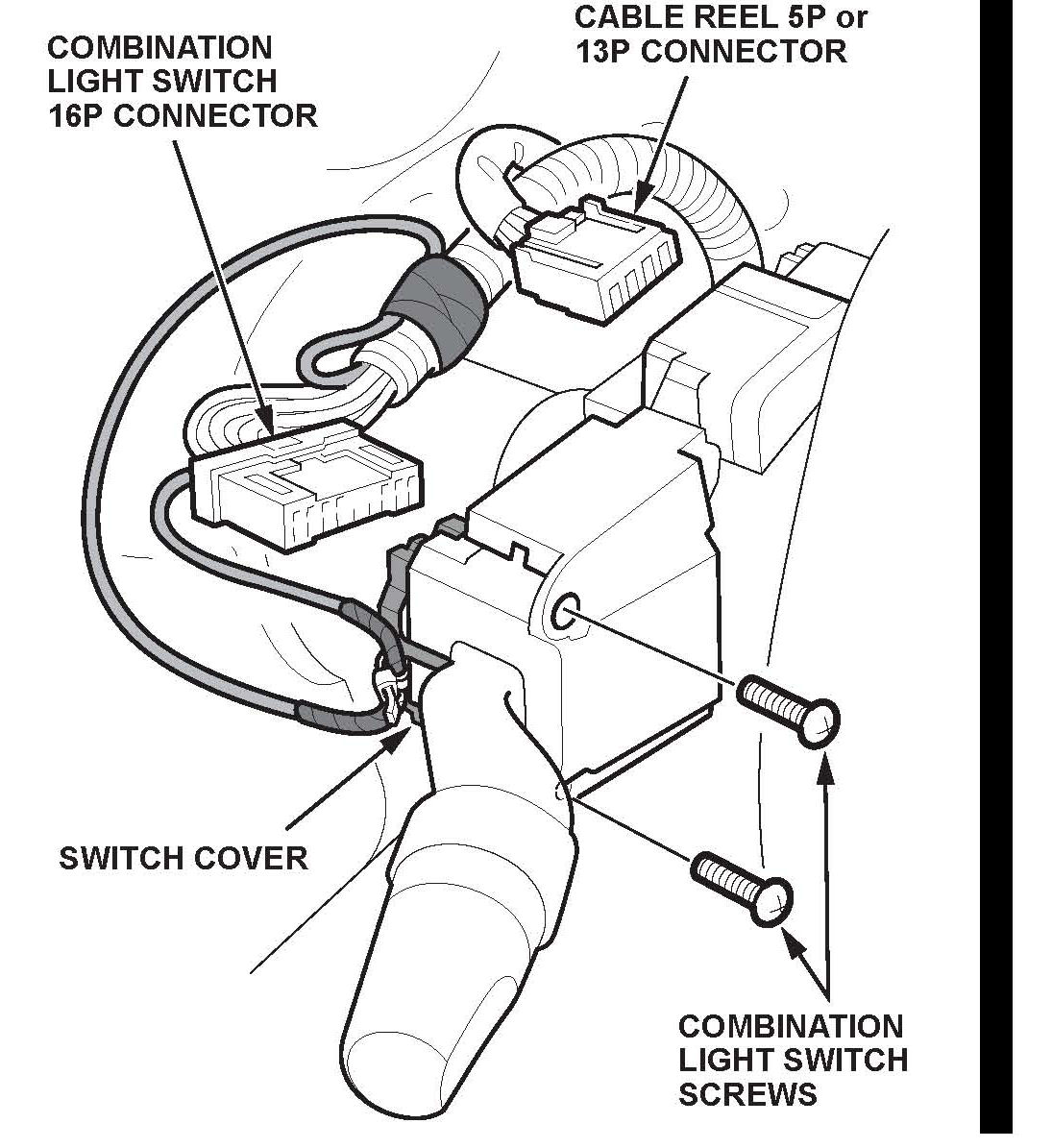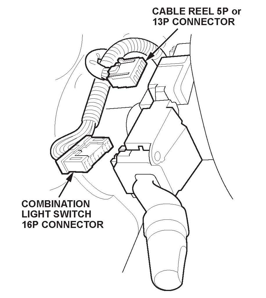 5. Disconnect the 16P connector from the combination light switch and the 5P or 1 3P connector from the cable reel. Then carefully pull the wire harness to the right of the steering column.