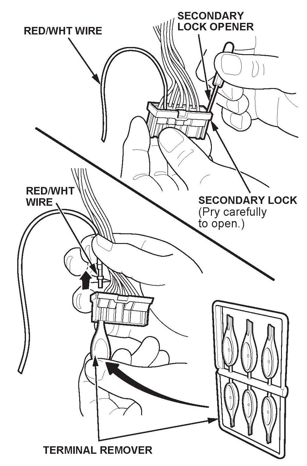 9. Using the secondary lock opener from the Terminal Maintenance Set (T/N 070AZ-S5A0100), carefully pry open the secondary lock on the RED/WHT wire side of the combination light switch 16P connector.