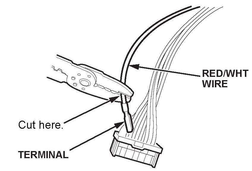 16. Cut the vehicle side RED/WHT wire near the terminal, then strip off 7 mm of insulation from the end of the wire.