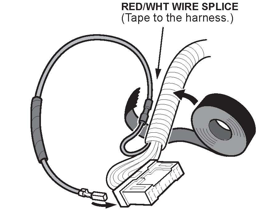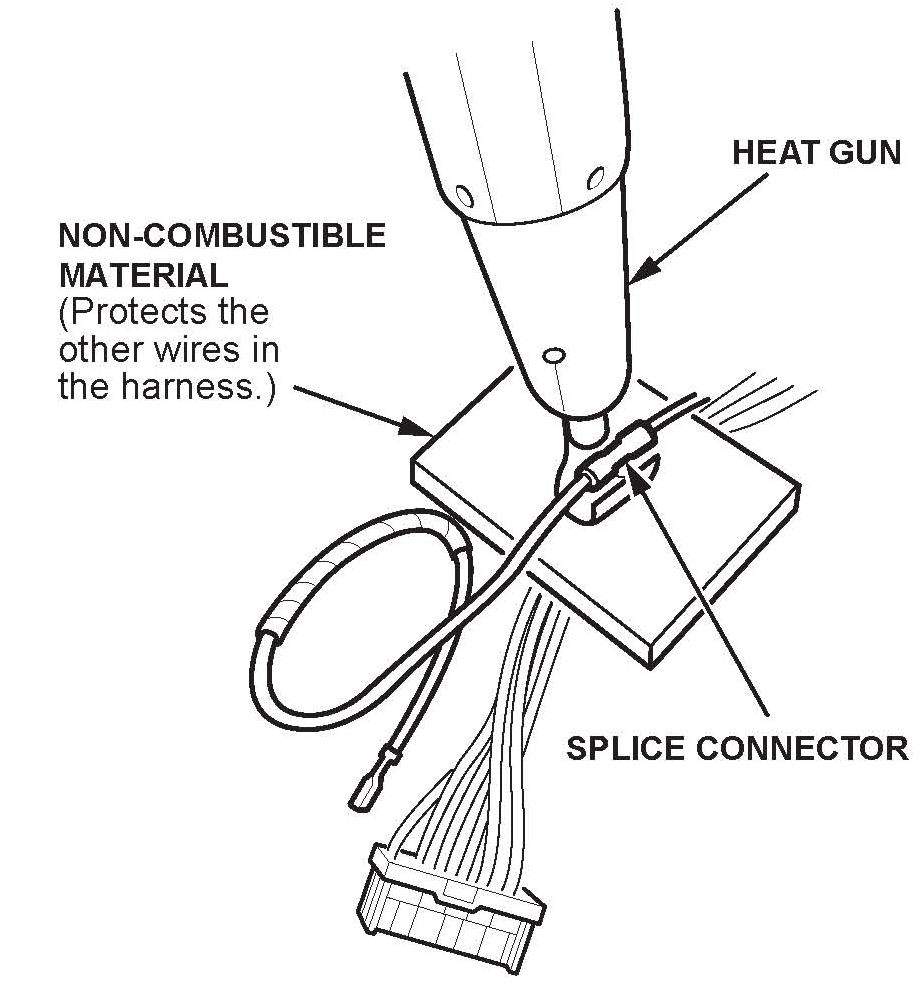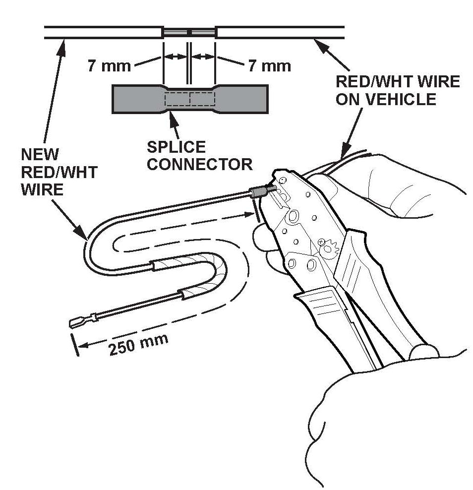 18. With a non-combustible material between the RED/WHT wire and the vehicle wire harness, use a heat gun to shrink the splice connector casing.