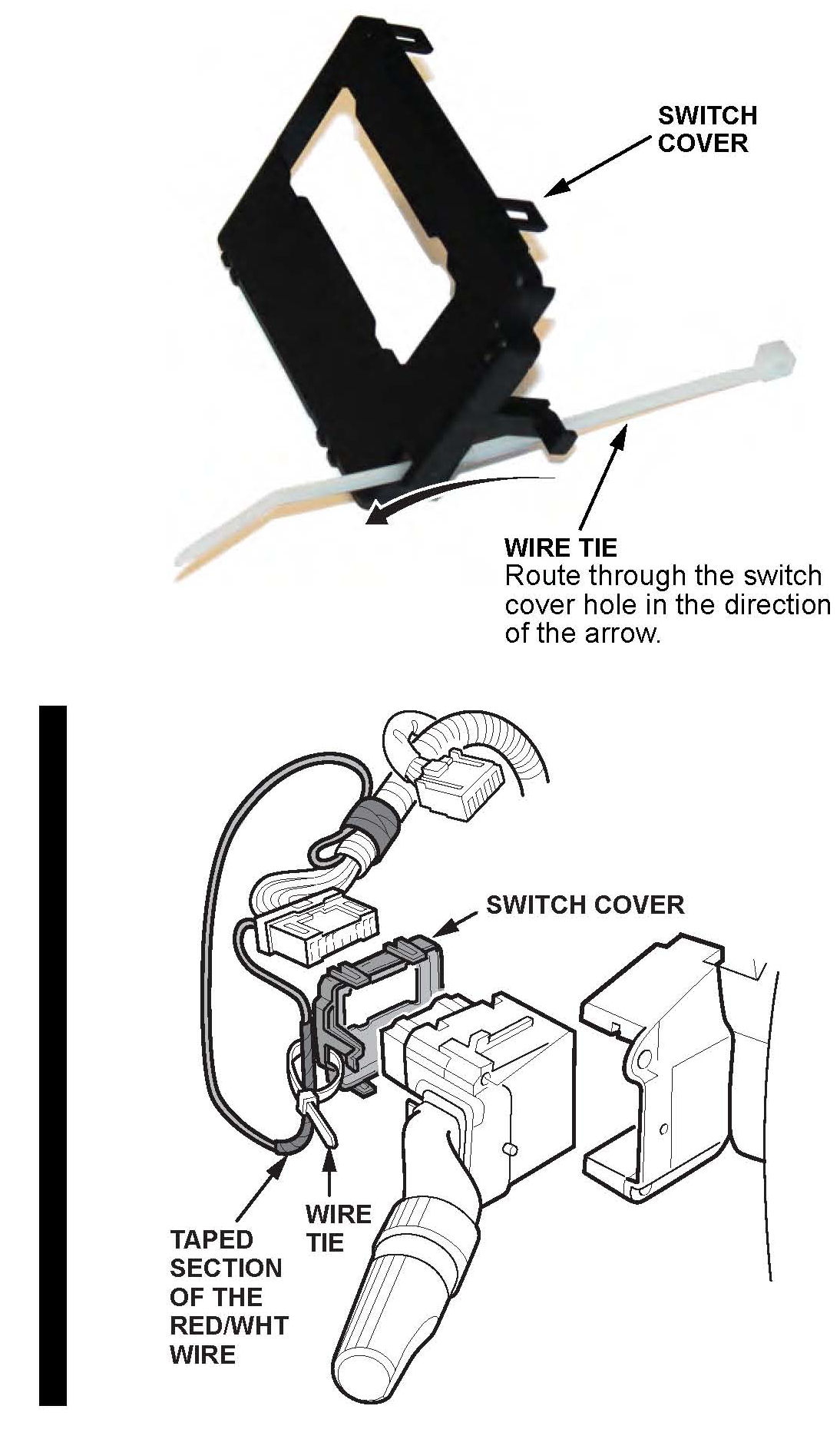 22. As shown, route the wire tie from the kit through the hole in the lower corner of the switch cover. Then use the wire tie to secure the RED/WHT wire (in the section you taped in step 14) to the switch cover. Cut off the excess wire tie.