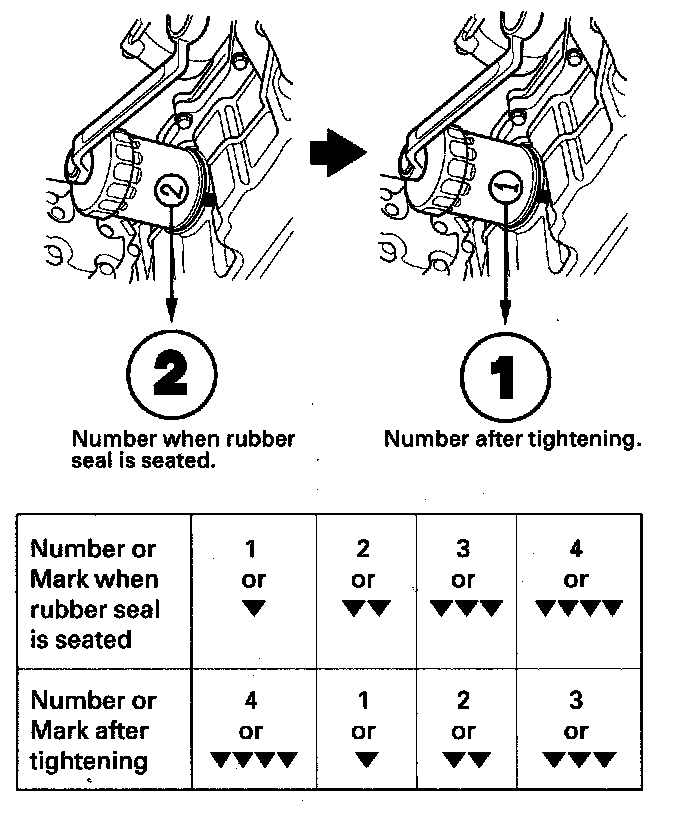 ^ Spin the filter on until its seal lightly seats against the oil pan, and note which number or mark is at the bottom.