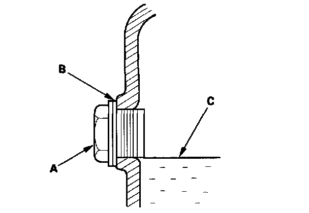 2. Remove the oil filler plug (A) and washer (B), check the condition of the fluid, and make sure the fluid is at the proper level (C).