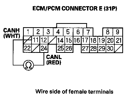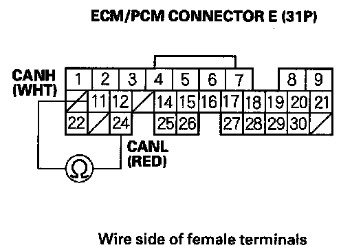 21. Measure resistance between ECM/PCM connector terminals E11 and E24.