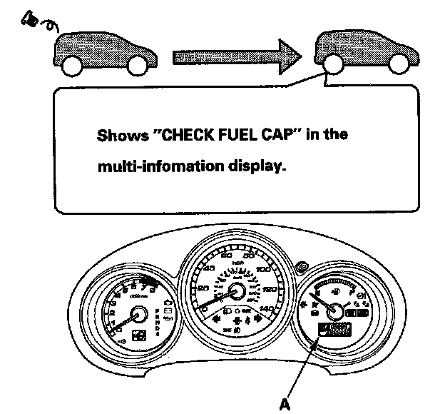 The first time a leak is detected a "CHECK FUEL CAP" message appears in the multi-information display (A). To scroll to another message, press the select/reset button. The "CHECK FUEL CAP" message will appear each time you restart the engine until the system turns the message off. Turn the engine off then replace or tighten the fuel fill cap until it clicks at least once.