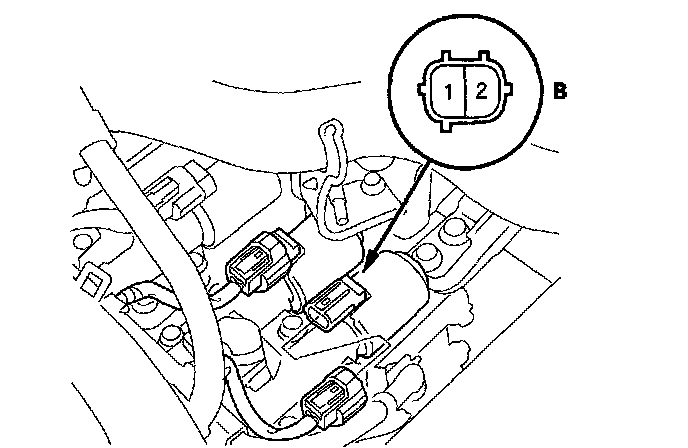 11. Connect a jumper wire from the negative battery terminal to A/T clutch pressure control solenoid valve B connector terminal No. 2, and connect another jumper wire from the positive battery terminal to connector terminal No. 1. Make sure A/T clutch pressure control solenoid valve B moves.