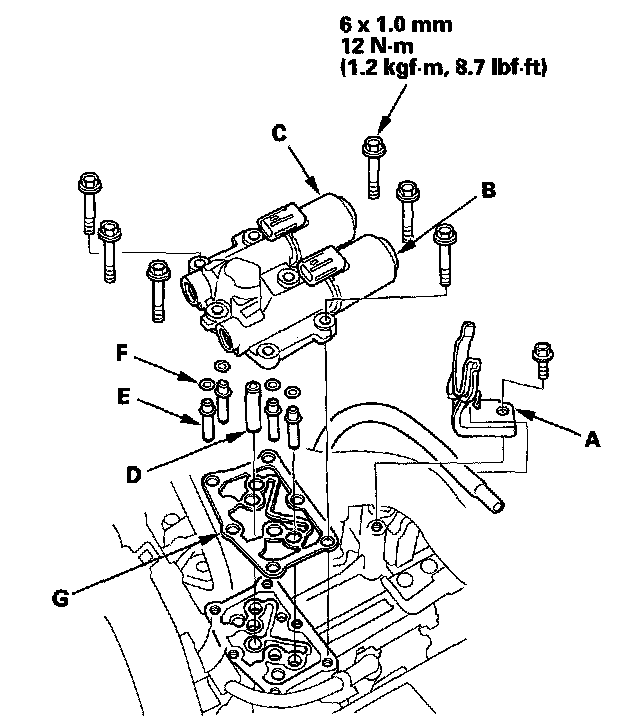 9. Remove the ATF pipe (D), the ATF joint pipes (E), the O-rings (F), and the gasket (G).