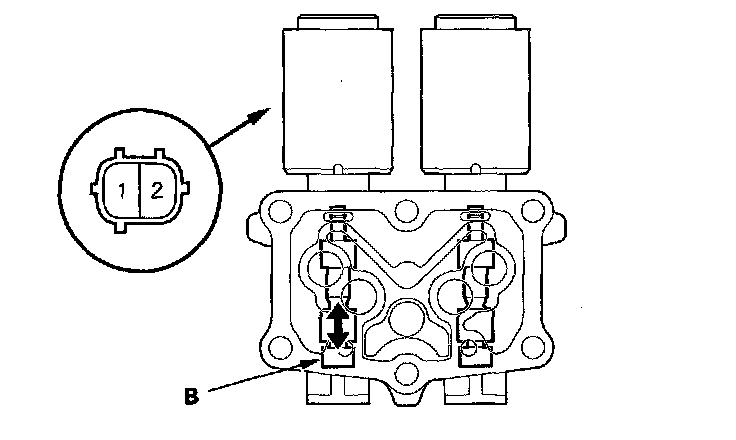 12. Disconnect one of the jumper wires, and check valve movement at the fluid passage in the valve body mounting surface. If the valve binds or moves sluggishly, or if the solenoid valve does not operate, replace A/T clutch pressure control solenoid valves B and C.