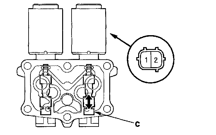 11. Connect a jumper wire from the negative battery terminal to A/T clutch pressure control solenoid valve C connector terminal No. 2, and connect another jumper wire from the positive battery terminal to connector terminal No. 1. Make sure A/T clutch pressure control solenoid valve C moves.