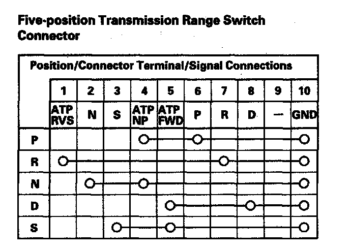 4. The transmission range switch test is finished if the test results are OK. If there is no continuity between any terminals, go to step 5.