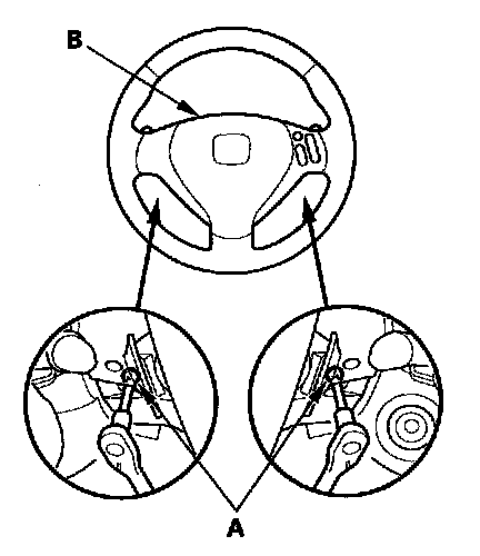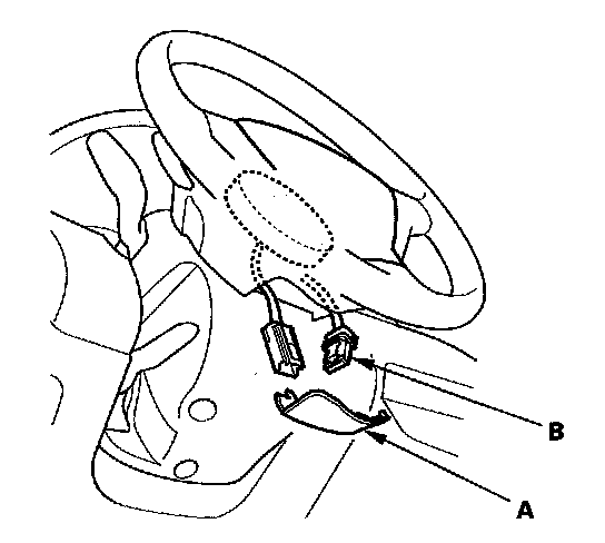 2. Remove the access panel (A) from the steering wheel, then disconnect the driver's airbag 4P connector (B) from the cable reel.