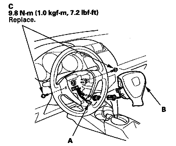2. Place the driver's airbag in the steering wheel, and secure it with new TORX bolts (C).