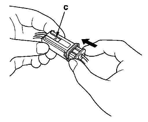 To reconnect, hold the pawl-side connector, and press on the back of the sleeve-side connector in the direction shown. As the two connector halves are pressed together, the sleeve (A) is pushed back by the pawl (C). Do not touch the sleeve.