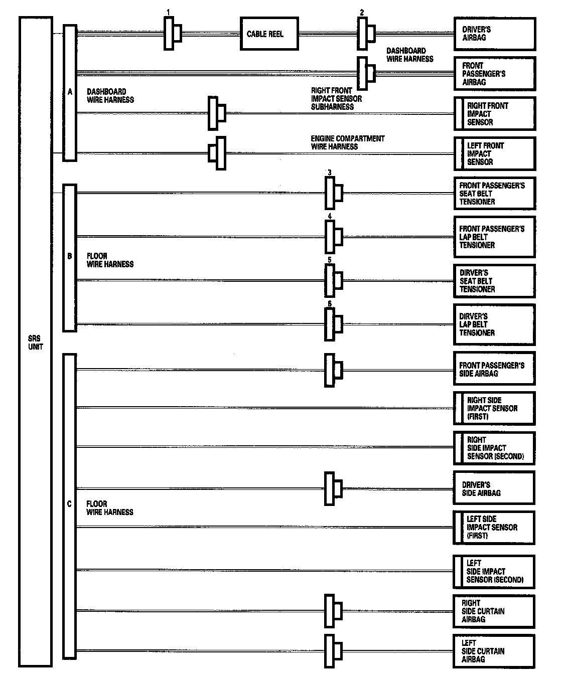 - Before disconnecting SRS unit connector B from the SRS unit, disconnect both seat belt tensioner 4P connectors and both lap belt tensioner 2P connectors (3, 4, 5, 6).