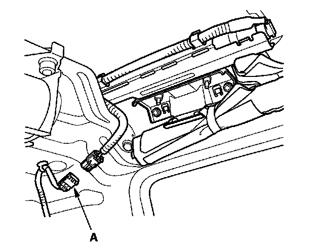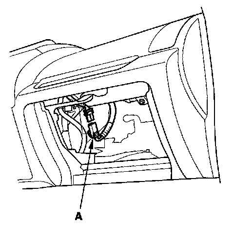 3. Remove the lower glove box, then disconnect the front passenger's airbag 4P connector (A) from the dashboard wire harness.